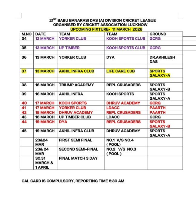 लखनऊ . Babu Banarasi Das (A) Division Cricket League के 21वें संस्करण के आगामी मुकाबलों का शेड्यूल जारी कर दिया गया है। यह प्रतियोगिता Cricket Association Lucknow की ओर से आयोजित की जा रही है। जारी फिक्स्चर के अनुसार 12 मार्च 2026 से लीग के कई अहम मुकाबले खेले जाएंगे।