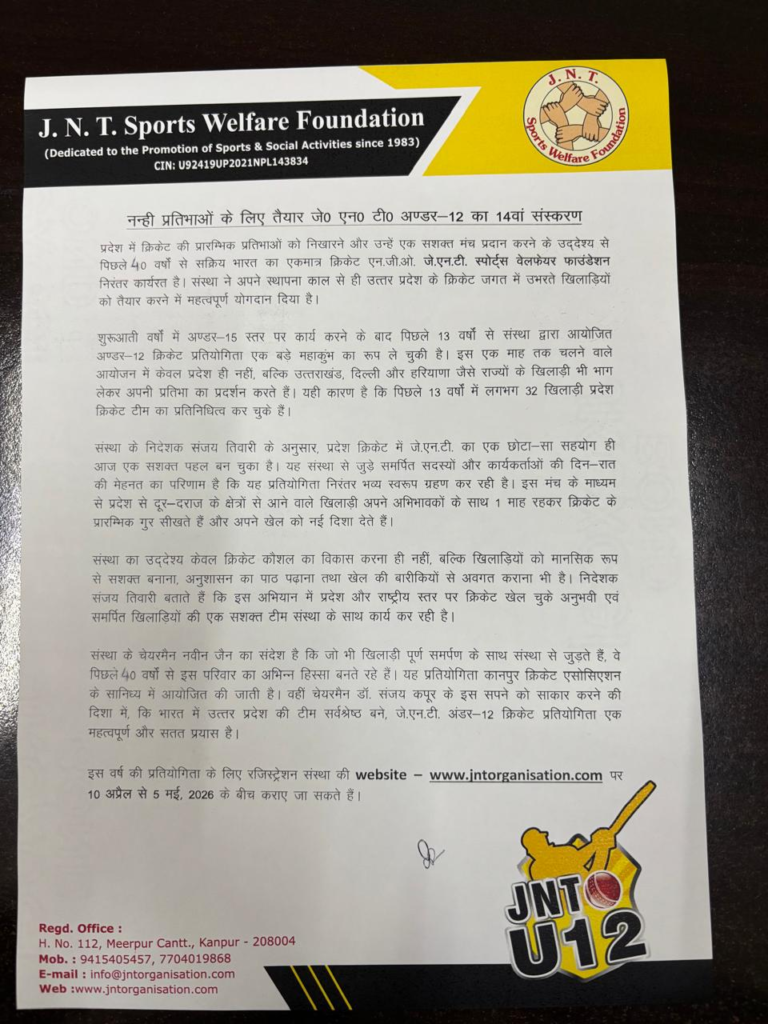 कानपुर। प्रदेश की नन्ही क्रिकेट प्रतिभाओं के लिए एक बड़ी खुशखबरी सामने आई है। जे.एन.टी. स्पोर्ट्स वेलफेयर फाउंडेशन द्वारा आयोजित प्रतिष्ठित JNT अंडर-12 क्रिकेट प्रतियोगिता का 14वां संस्करण जल्द ही आयोजित होने जा रहा है। पिछले चार दशकों से खेल और सामाजिक गतिविधियों को बढ़ावा देने वाली यह संस्था लगातार युवा खिलाड़ियों को मंच प्रदान कर रही है।