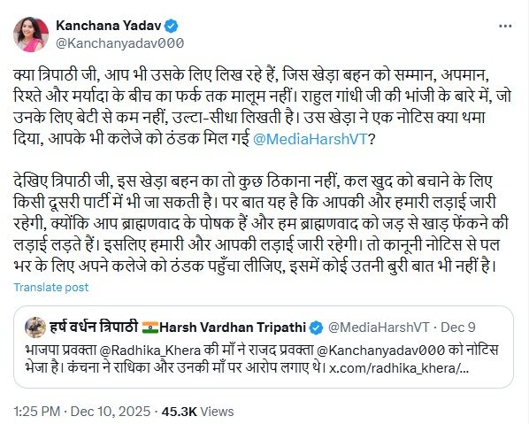कानूनी नोटिस के बाद, कंचन यादव ने राधिका खेड़ा पर एक लंबा पोस्ट जारी करते हुए जवाब दिया कि ‘पहले जाकर गंगा में गोते लगाकर थोड़ा पवित्र हो लो। और गंगा मैया से कांग्रेस में रहने के लिए माफ़ी मांग लो। बाकी जो घपला आपने और आपकी माँ ने मिलकर किया था, जिसके लिए बीजेपी ने आपको जेल में डालने की धमकी दी थी और आपकी माँ को भी जिसके लिए आपको गोबरभक्त की कैटेगरी में शामिल होकर अपने चरित्र को अंधभक्ति में बदलना पड़ा वो सब मामला ठीक हो गया न बहन’