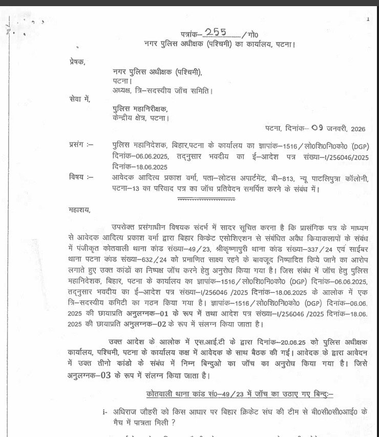 इस बीच बिहार पुलिस की एक विशेष जांच समिति (SIT) ने बिहार क्रिकेट एसोसिएशन से जुड़े दो प्रमुख आपराधिक मामलों में पूर्व की गई जांच को “त्रुटिपूर्ण” बताते हुए दोबारा जांच की सिफारिश की है। इससे क्रिकेट प्रशासन में कथित अनियमितताओं और राजनीतिक रसूख के दुरुपयोग को लेकर सवाल और गहरे हो गए हैं।