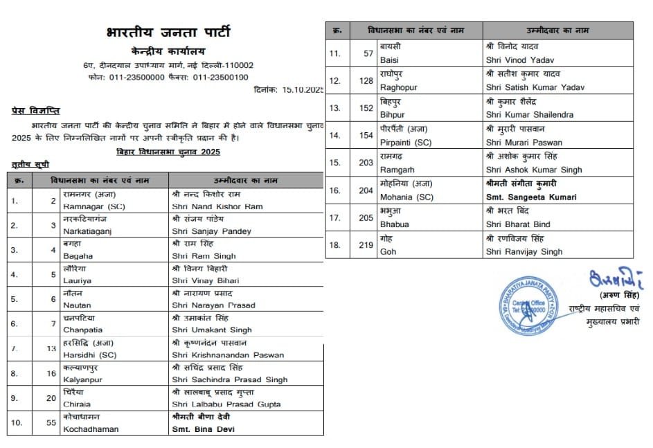 बीजेपी ने 14 अक्टूबर को अपनी पहली सूची जारी की थी, जिसमें 71 नाम शामिल थे. अब तीसरी सूची के साथ बीजेपी ने अपने सभी 101 प्रत्याशियों के नाम सार्वजनिक कर दिए हैं, जिससे बिहार चुनाव में पार्टी की पूरी रणनीति साफ हो गई है.