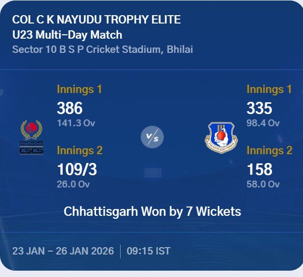 लक्ष्य का पीछा करने उतरी छत्तीसगढ़ की दूसरी पारी की शुरुआत हालांकि अच्छी नहीं रही और सलामी बल्लेबाज प्रीतम (1) और शोभित शर्मा (8) जल्दी पवेलियन लौट गए। इसके बाद हर्ष साहू ने सर्वाधिक 35 रन बनाए, जबकि साहिल (33) और राहुल (22) के योगदान से छत्तीसगढ़ ने लक्ष्य हासिल कर मुकाबला सात विकेट से जीत लिया।