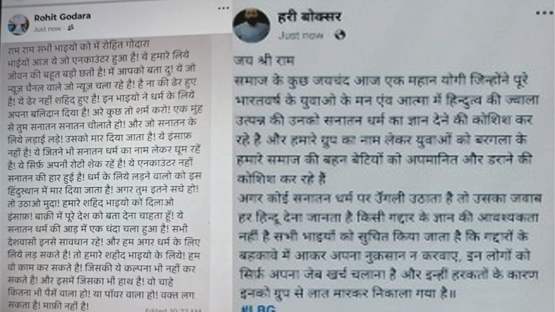 पुलिस एनकाउंटर में मारे गये दो आरोपियों की मौत के बाद गुरुवार को गैंगस्टर गोल्डी बराड़ के साथी रोहित गोदारा ने धमकी दी थी. जिसके बाद अब लॉरेंस बिश्नोई गैंग के खास सदस्य हरि बॉक्सर ने शुक्रवार को फेसबुक पोस्ट के माध्यम से रोहित गोदारा को ‘गद्दार’ करार देते हुए कहा कि ‘समाज के कुछ जयचंद आज एक महान योगी जिन्होंने पूरे भारतवर्ष के युवाओं के मन एवं आत्मा में हिन्दुत्व की ज्वाला उत्पन्न की उनको सनातन धर्म का ज्ञान देने की कोशिश कर रहे हैं और हमारे ग्रुप का नाम लेकर युवाओं को बरगलाने के लिए हमारे समाज की बहन बेटियों को अपमानित और डराने की कोशिश कर रहे हैं.’