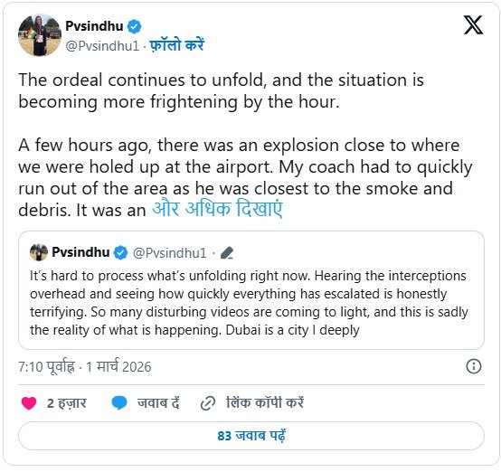 करीब नौ घंटे बाद अपनी दूसरी पोस्ट में सिंधु ने बताया कि स्थिति अब भी तनावपूर्ण बनी हुई है। उन्होंने लिखा कि हर गुजरता घंटा और अधिक डरावना महसूस हो रहा है। एयरपोर्ट के पास एक धमाके की आवाज सुनाई दी, जिसके बाद उनके कोच को तुरंत वहां से हटना पड़ा क्योंकि वह धुएं और मलबे के काफी करीब थे। सिंधु ने इसे बेहद तनावपूर्ण और भयावह पल बताया।