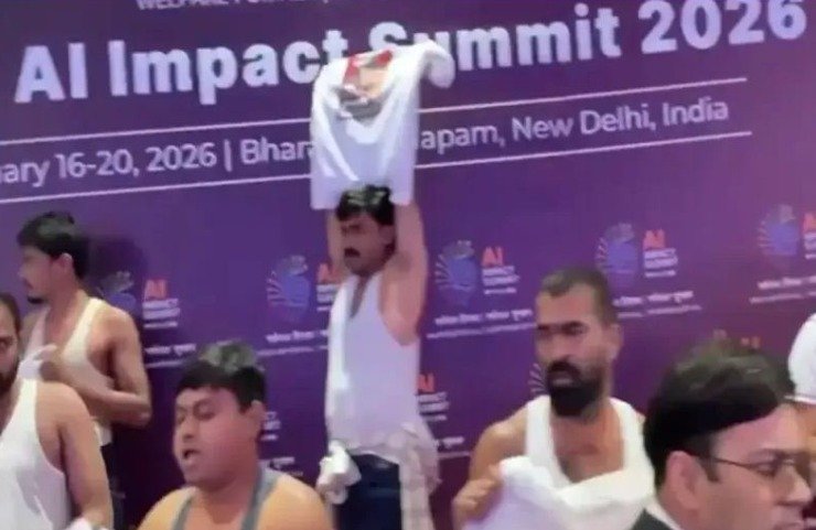 नई दिल्ली के भारत मंडपम में चल रहे India AI Impact Summit 2026 के दौरान उस वक्त हलचल मच गई, जब भारतीय युवा कांग्रेस (IYC) के कुछ कार्यकर्ताओं ने अचानक ‘शर्टलेस’ प्रदर्शन शुरू कर दिया।