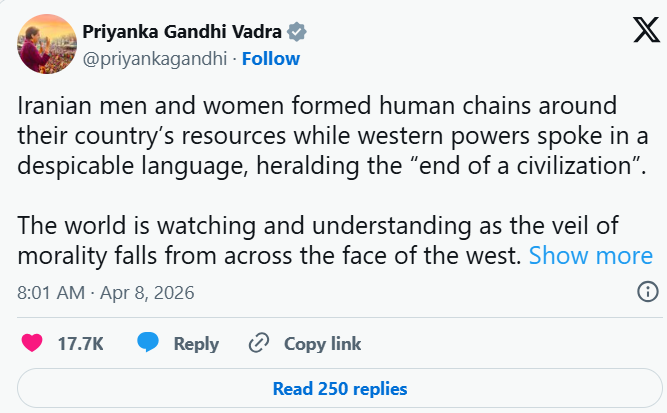 Priyanka Gandhi ने इस पर प्रतिक्रिया देते हुए कहा कि जब पश्चिमी ताकतें ‘एक सभ्यता के अंत’ जैसी भाषा का इस्तेमाल कर रही थीं, तब ईरान के लोग अपने संसाधनों की रक्षा के लिए एकजुट होकर खड़े थे।