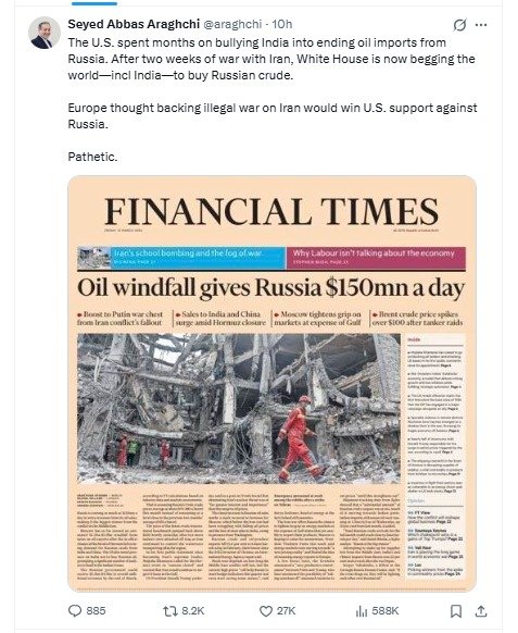 अरागची ने सोशल मीडिया प्लेटफॉर्म X पर पोस्ट करते हुए लिखा कि अमेरिका ने महीनों तक भारत को Russia से तेल आयात बंद करने के लिए धमकाया और दबाव बनाया। लेकिन ईरान के साथ दो हफ्ते के युद्ध के बाद अब व्हाइट हाउस पूरी दुनिया से, भारत समेत, रूसी क्रूड खरीदने की “भीख” मांग रहा है।