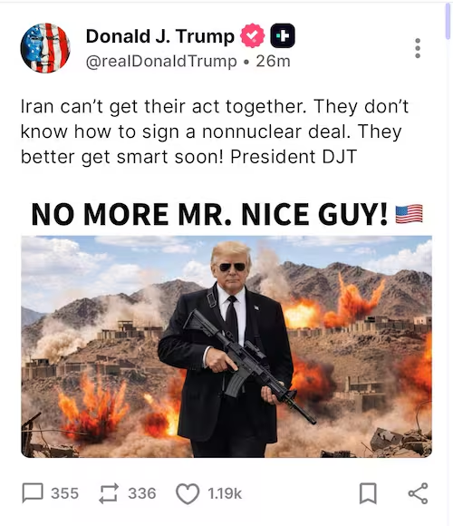डोनाल्ड ट्रंप ने सोशल मीडिया पर स्पष्ट किया कि अमेरिका अब ईरान पर छोटे सैन्य हमलों के बजाय लंबे समय तक चलने वाली आर्थिक नाकेबंदी पर ध्यान केंद्रित करेगा।इसी बीच अमेरिका के राष्ट्रपति डोनाल्ड ट्रंप ने ईरान के खिलाफ अपना रुख और कड़ा कर दिया है। उन्होंने सोशल मीडिया पर चेतावनी देते हुए कहा कि ईरान को जल्द ही बिना परमाणु हथियार वाला समझौता करना होगा, नहीं तो उसे गंभीर परिणाम भुगतने पड़ सकते हैं। ट्रंप ने अपने पोस्ट में लिखा कि ईरान सही तरीके से समझौता करना नहीं जानता और उसे जल्दी समझदारी दिखानी चाहिए। ट्रंप की पोस्ट काफी ड्रैमेटिक है, जिसमें वे एक गन के साथ बारूदी आग के बीच नजर आ रहे हैं।