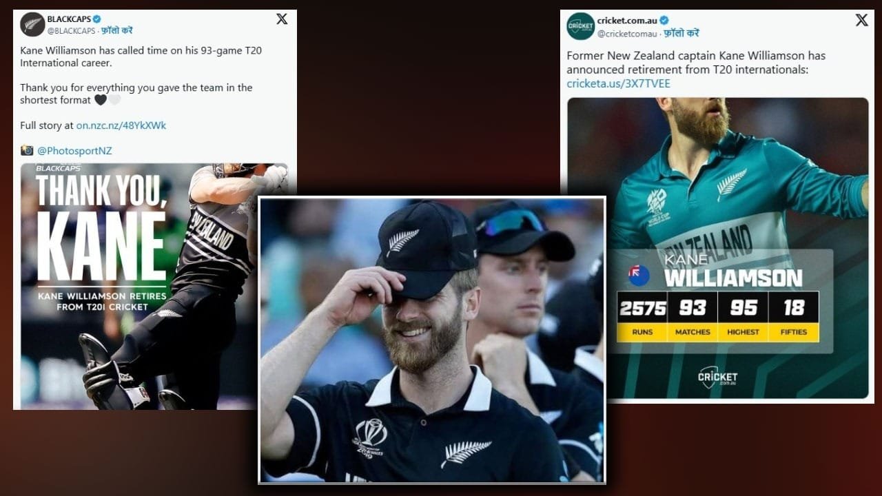 न्यूजीलैंड के दिग्गज बल्लेबाज और पूर्व कप्तान केन विलियमसन ने टी20 इंटरनेशनल क्रिकेट से संन्यास की घोषणा कर दी है. यह फैसला 2026 टी20 वर्ल्ड कप से महज चार महीने पहले आया है, जिससे न्यूजीलैंड क्रिकेट को गहरा झटका लगा है. विलियमसन न्यूजीलैंड के टी20 क्रिकेट में दूसरे सबसे ज्यादा रन बनाने वाले बल्लेबाज हैं. उन्होंने 2011 में अपना पहला टी20 मैच खेला था और 2021 में टीम को फाइनल तक पहुंचाने में अहम भूमिका निभाई. अपने करियर में उन्होंने कुल 93 मैच खेले हैं, जिनमें 2575 रन बनाए हैं. उनका बल्लेबाजी औसत 33.00 है, उन्होंने 18 अर्धशतक लगाए हैं और उनका सबसे बड़ा स्कोर 95 रन है. कप्तान के तौर पर उन्होंने 75 मैचों में टीम की कमान संभाली, और उनकी कप्तानी में न्यूजीलैंड 2016 और 2022 के सेमीफाइनल और 2021 के फाइनल में पहुंचा