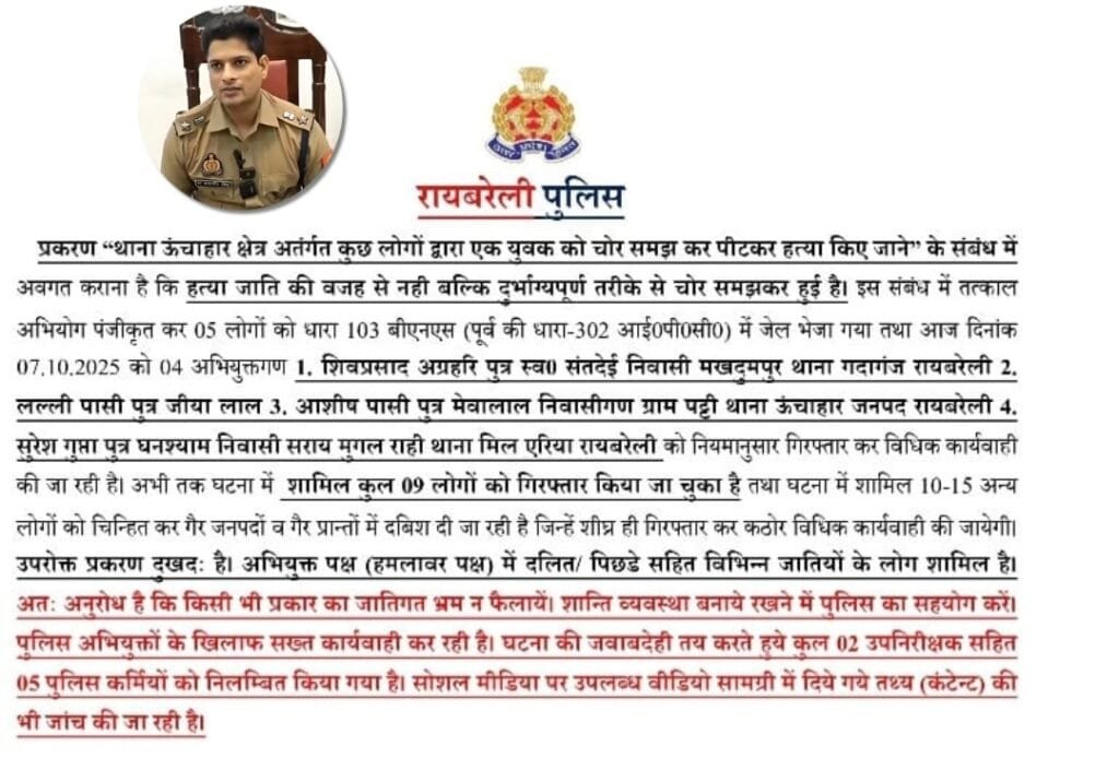 दरअसल फतेहपुर जिले के तारावती गांव निवासी 38 वर्षीय हरिओम बीते बुधवार 2 अक्टूबर की रात अपनी ससुराल जाने के लिए पैदल निकले थे. रास्ते में गदागंज थाना क्षेत्र के एक ढाबे के पास ग्रामीणों ने उन्हें संदिग्ध मान लिया और चोर समझकर बेरहमी से पीट-पीटकर मार डाला. भीड़ की पिटाई से दलित युवक की मौके पर ही मौत हो गई थी.