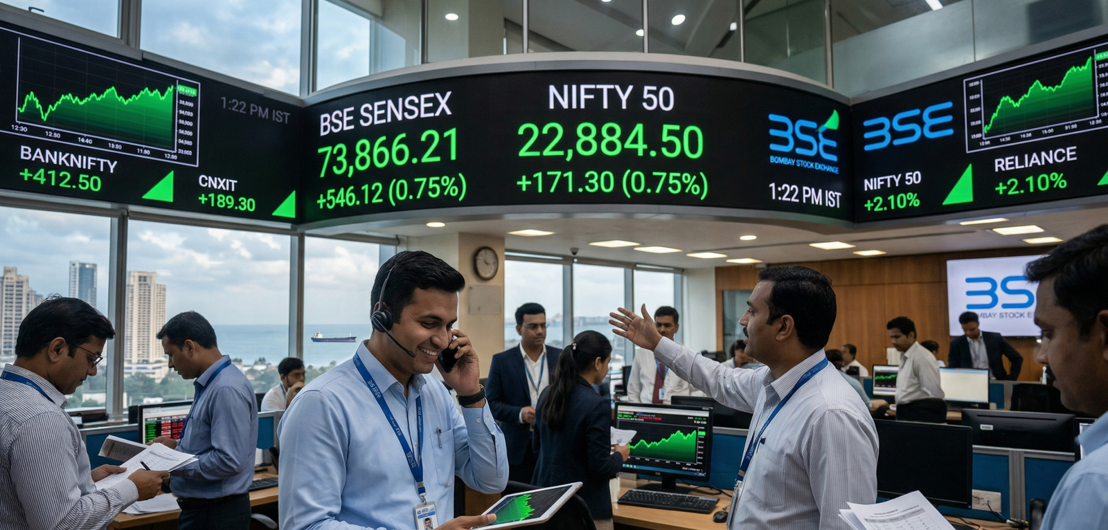 सोमवार, 6 अप्रैल 2026 को भारतीय शेयर बाजार में शुरुआती उतार-चढ़ाव के बाद दोपहर तक जबरदस्त रिकवरी देखने को मिली। बीएसई सेंसेक्स (BSE Sensex) 546 अंकों से ज्यादा की छलांग लगाकर 73,866 के स्तर पर पहुंच गया, जबकि निफ्टी 50 (Nifty 50) भी 171 अंकों की मजबूती के साथ 22,884 के आसपास कारोबार करता दिखा। इस तेजी का मुख्य कारण अमेरिका और ईरान के बीच तनाव कम होने की उम्मीद और अंतरराष्ट्रीय स्तर पर ‘स्ट्रेट ऑफ होर्मुज’ के दोबारा खुलने की संभावनाएं मानी जा रही हैं।