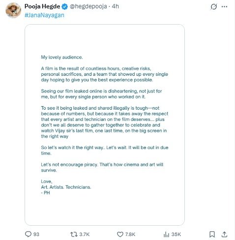 ‘जन नायकन’ थलपति विजय की ‘फेयरवेल फिल्म’ है, पूजा हेगड़े ने फैंस के ‘लॉयल्टी कार्ड’ को हिट करते हुए पूछा कि क्या हम उनकी लीगेसी का अपमान करना चाहते हैं? उन्होंने फैंस से अपील की कि विजय सर की आखिरी फिल्म का जश्न सिनेमाघरों के ‘लार्जर दैन लाइफ’ अनुभव के साथ ही मनाएं। उन्होंने जोर देकर कहा, “पायरेसी को इग्नोर करें और कला को मरने से बचाएं।”