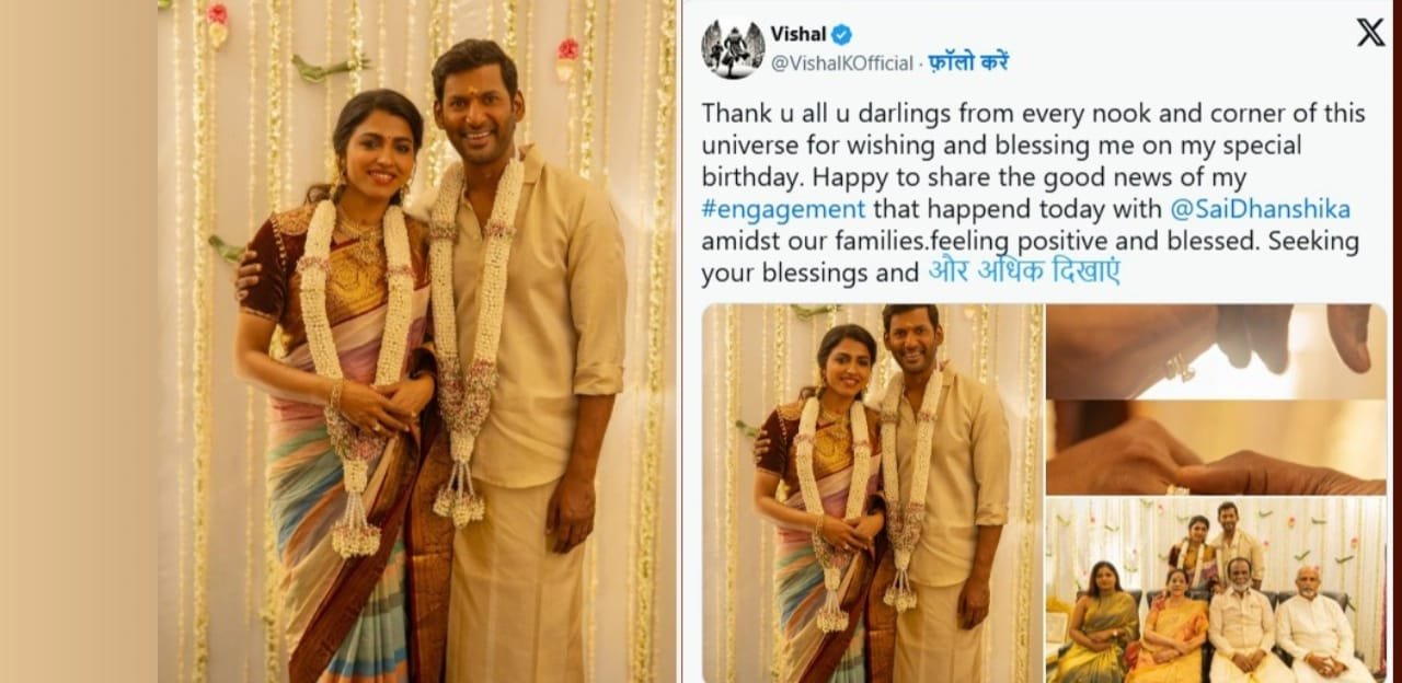 तमिल फिल्म जगत के लोकप्रिय अभिनेता विशाल ने अपने 47वें जन्मदिन के मौके पर अभिनेत्री साई धनशिका से सगाई कर ली. यह खास अवसर शुक्रवार को एक निजी समारोह में मनाया गया, जिसमें उनके परिवार और करीबी दोस्त शामिल हुए.