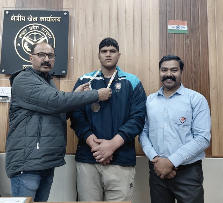 लखनऊ। केडी. सिंह बाबू स्टेडियम में आयोजित वेटलिफ्टिंग प्रतियोगिता में उत्कृष्ट प्रदर्शन करने वाले खिलाड़ी इकबाल चंद को आज क्षेत्रीय क्रीड़ा अधिकारी द्वारा सम्मानित किया गया।