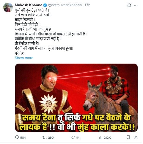 समय रैना का यह ‘डार्क ह्यूमर’ मुकेश खन्ना को रास नहीं आया। उन्होंने एक इंटरव्यू के दौरान समय को जमकर लताड़ा। खन्ना ने बेहद तीखे शब्दों का इस्तेमाल करते हुए कहा कि समय जैसे लोग लाइमलाइट बटोरने के लिए किसी भी हद तक गिर सकते हैं।
